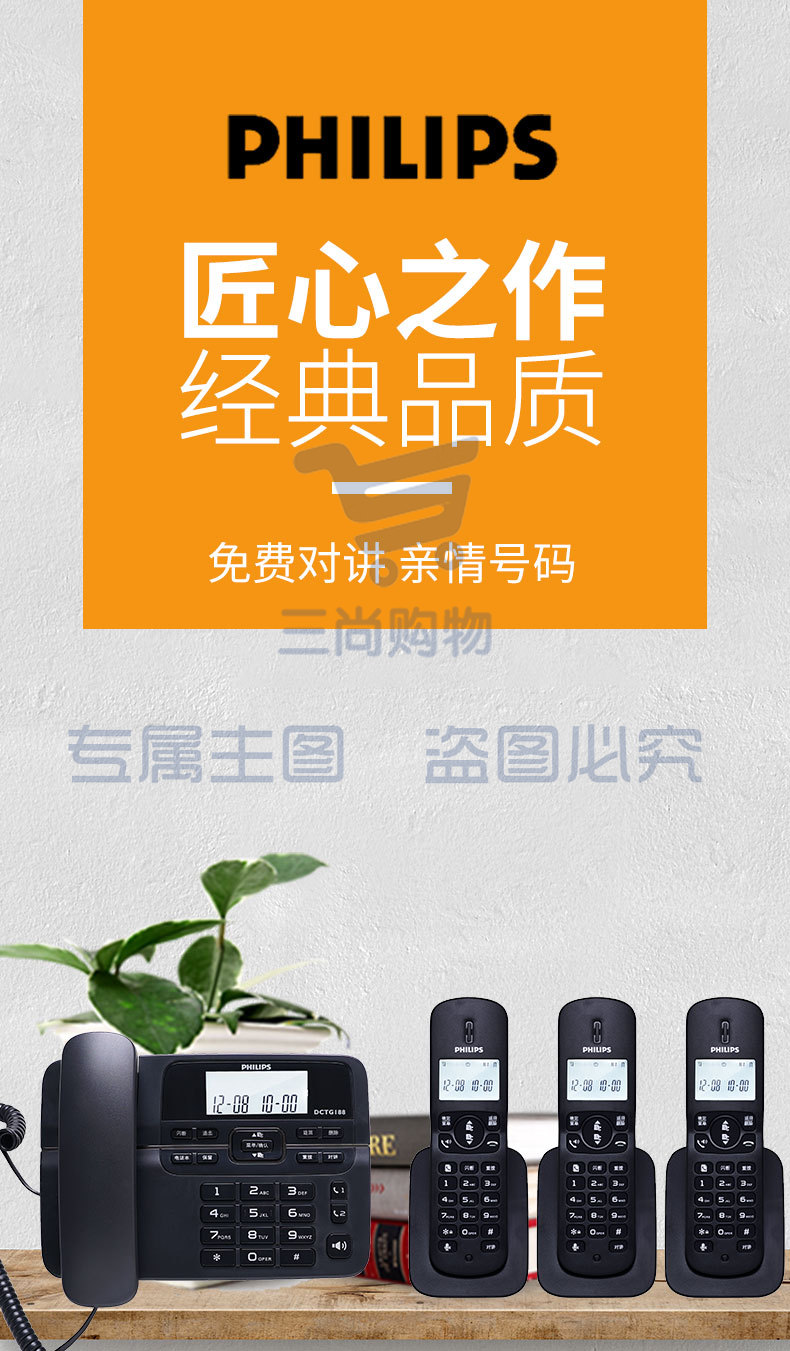 飞利浦DCTG188数字无绳电话机办公家用座机电话子母机免提通话/一键拨号/DCTG188一拖一(黑色)