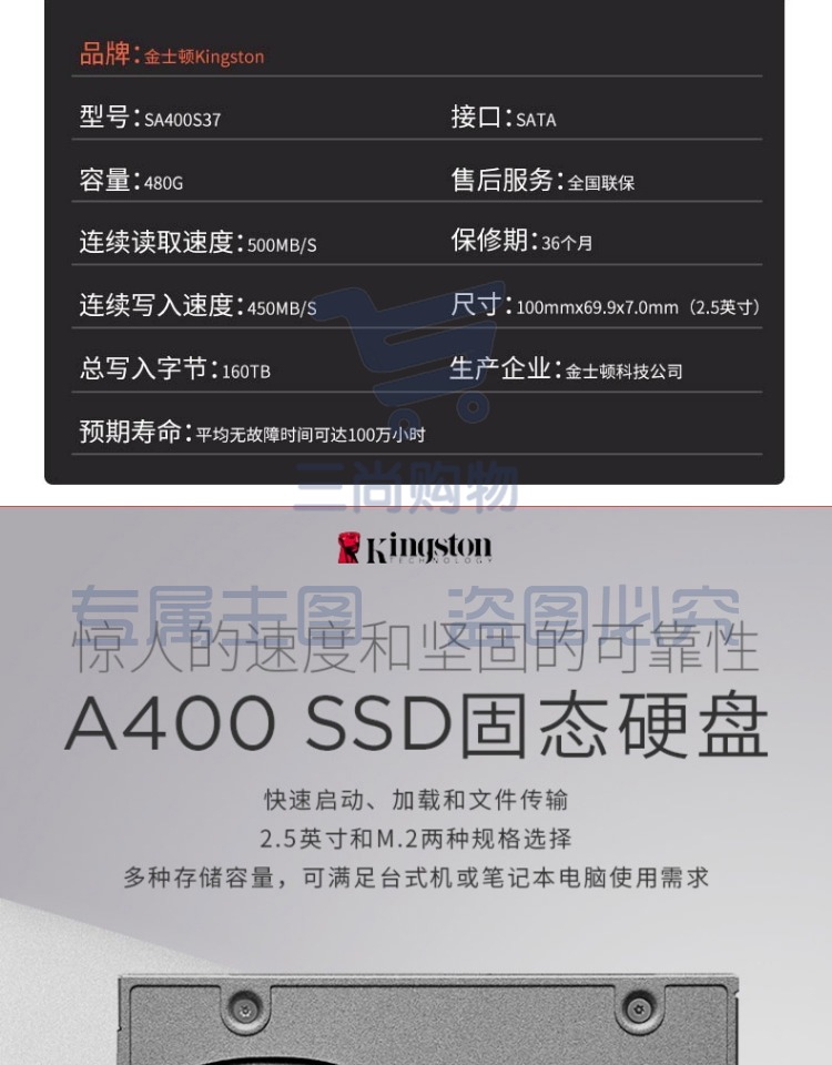 电脑升级SSD硬盘 金士顿(Kingston) 1TB SSD硬盘 SATA3.0接口 A400系列 含上门安装